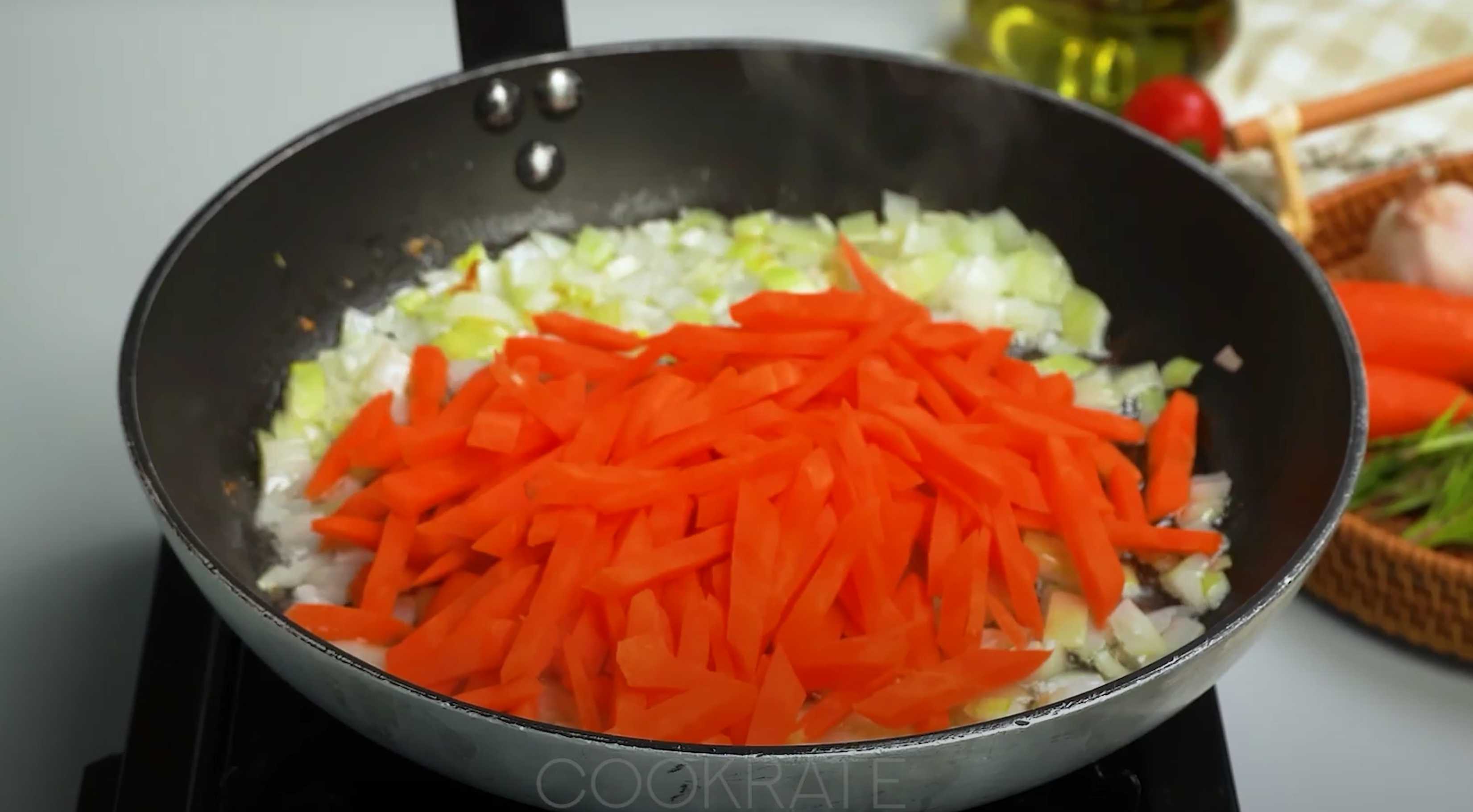 Ajoutez les carottes coupées en lamelles et faites-les revenir en remuant.