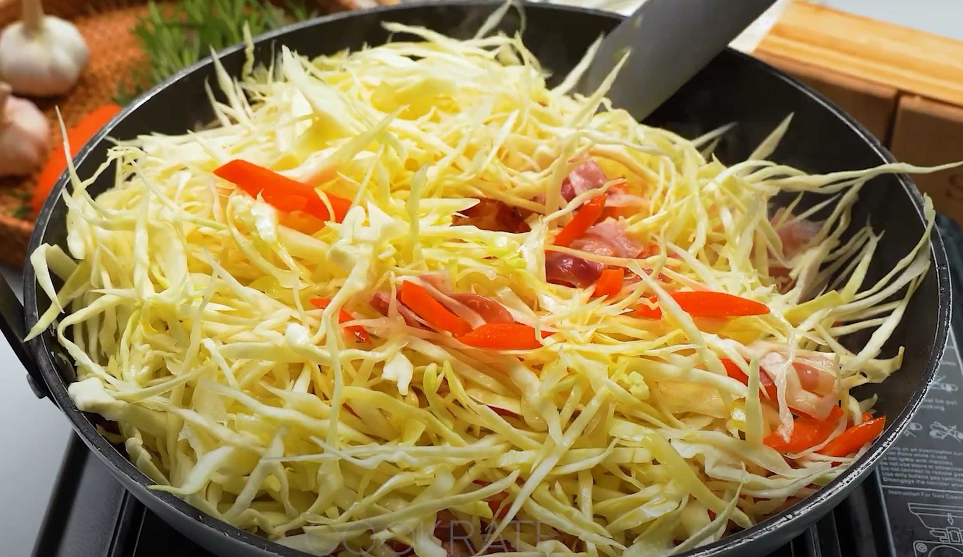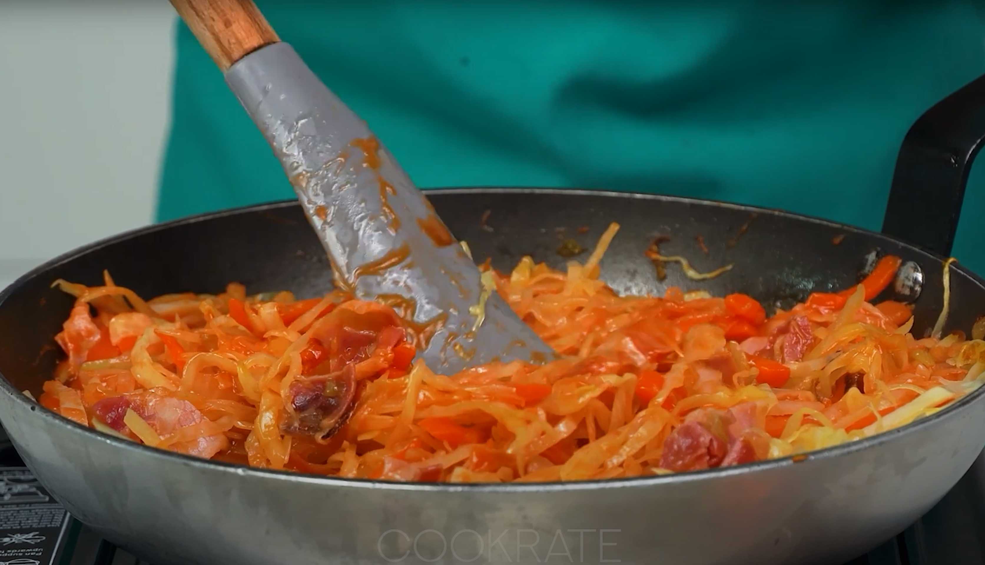 Hachez finement le chou et ajoutez-le dans la poêle. Remuez et laissez mijoter à couvert pendant 7 minutes à feu moyen.