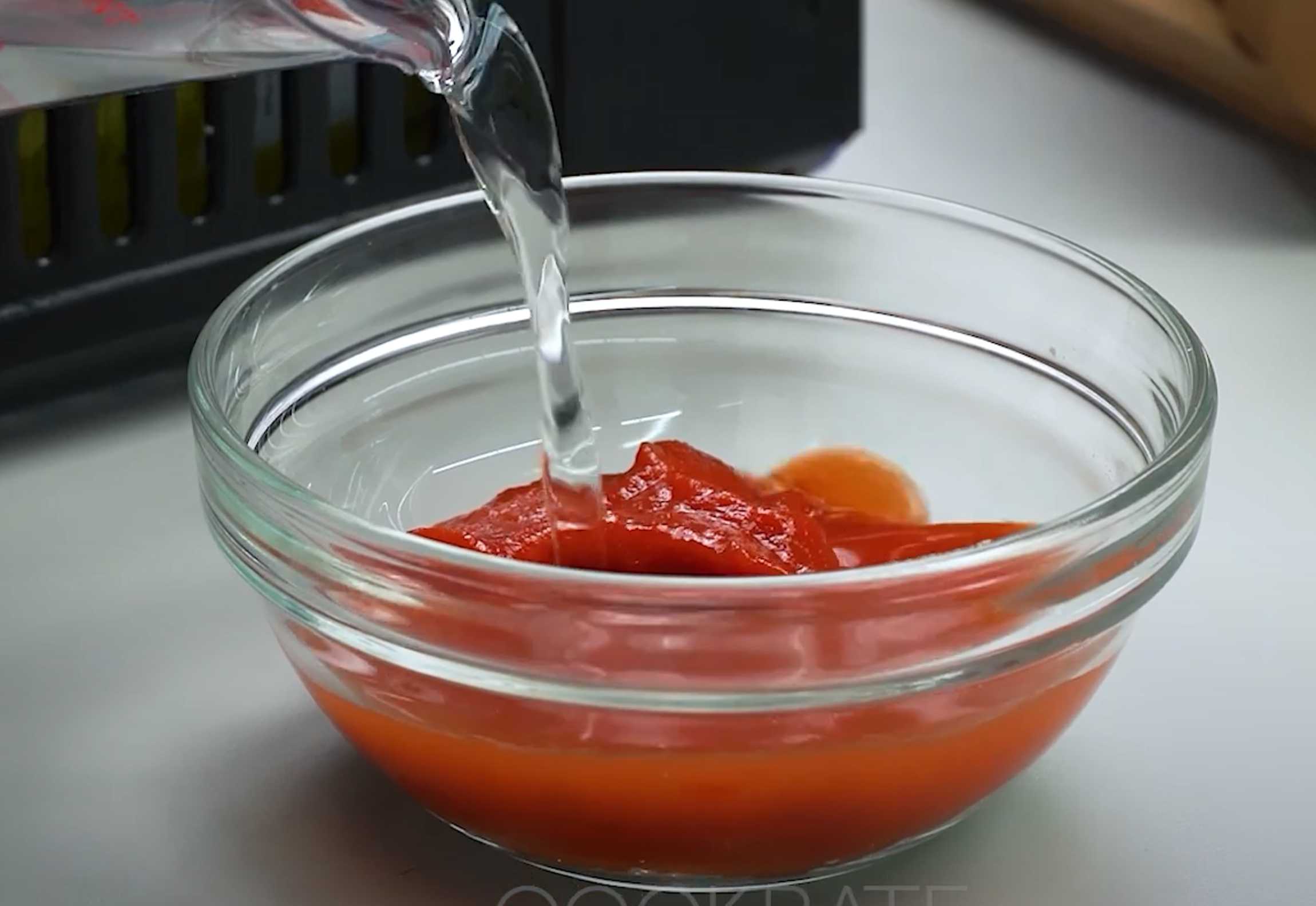 Mettez la farine dans un bol, ajoutez la sauce tomate, 150 ml d'eau et mélangez.