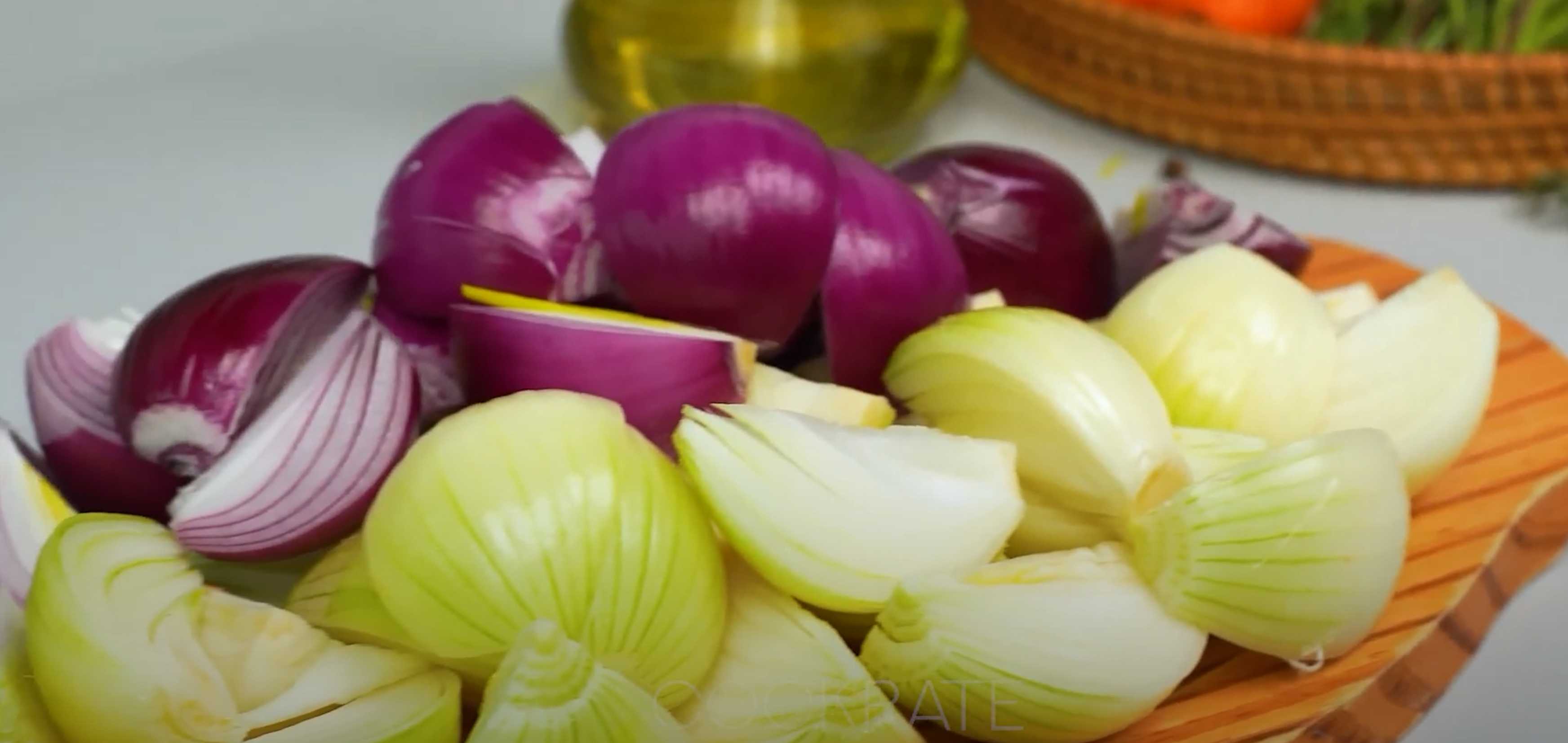 Hachez grossièrement les oignons blancs et rouges et placez-les dans une poêle avec de l'huile végétale.
