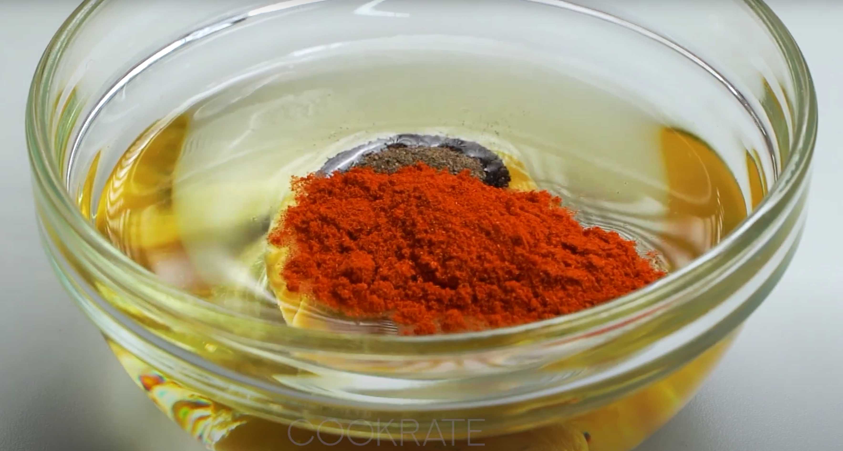 Mélangez 80 ml d'huile végétale et 30 grammes de moutarde dans un bol, ajoutez du poivre et du paprika, mélangez bien.