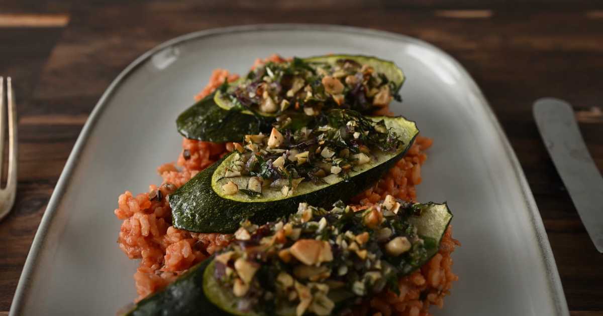 Déposez une portion de riz dans une assiette, garnissez-la de trois tranches de courgette et servez.