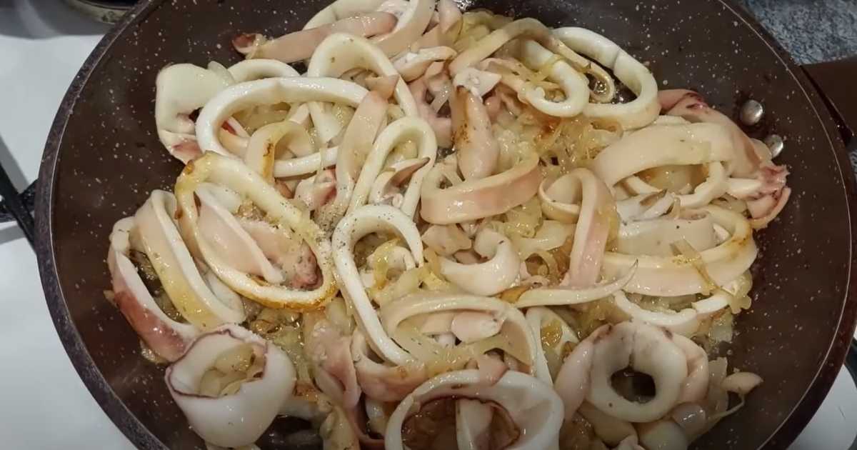 Ajoutez les calamars à l'oignon, assaisonnez de sel et de poivre et faites frire pendant 2 à 3 minutes.