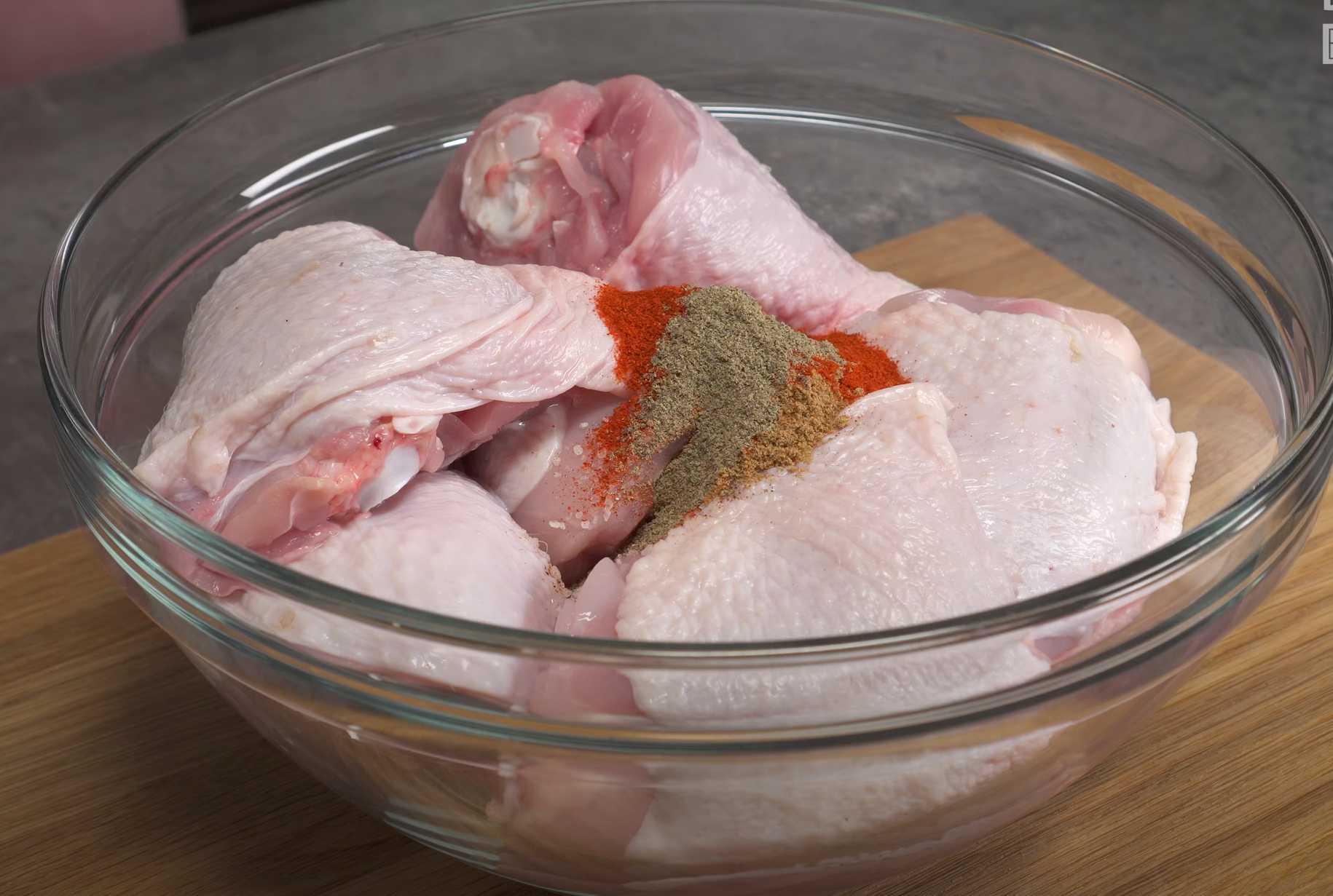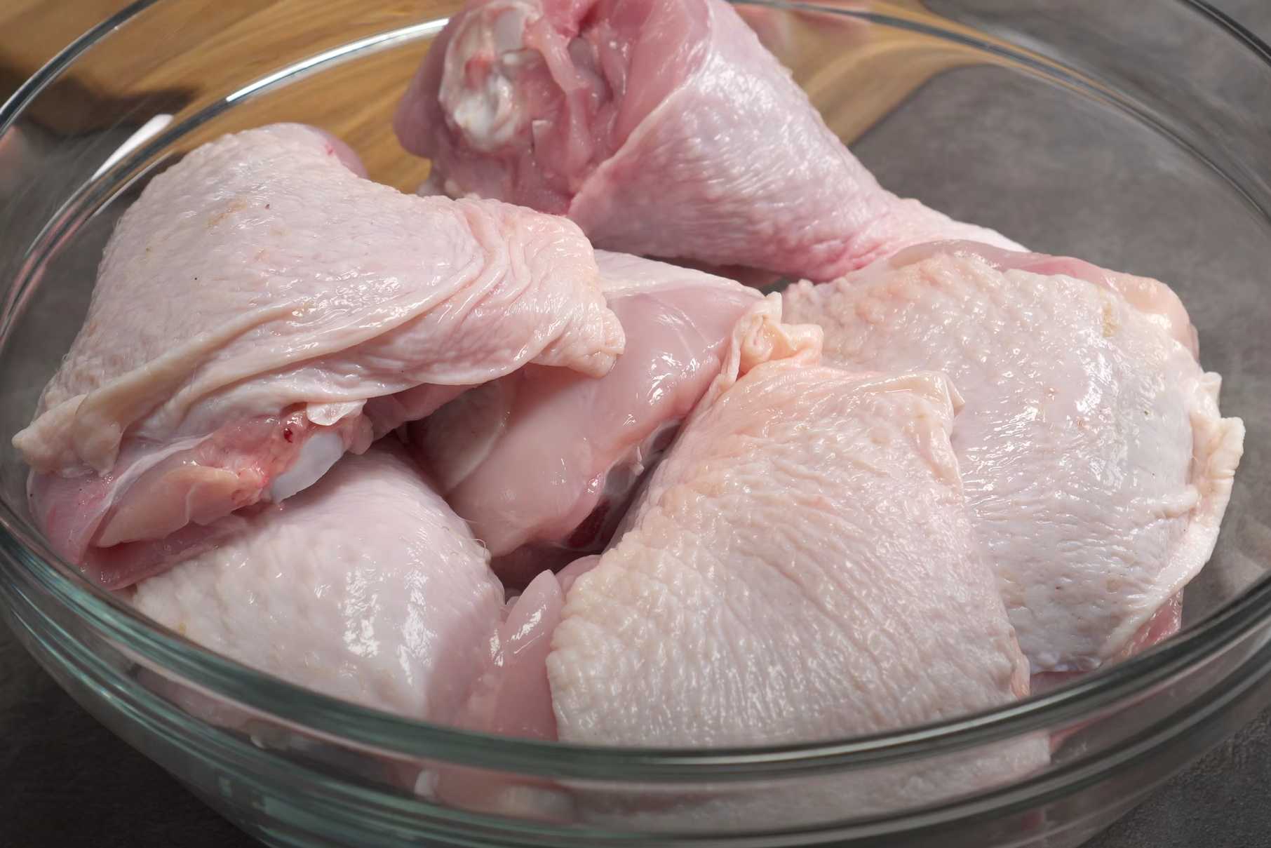 Coupez les cuisses de poulet en deux et placez-les dans un bol.