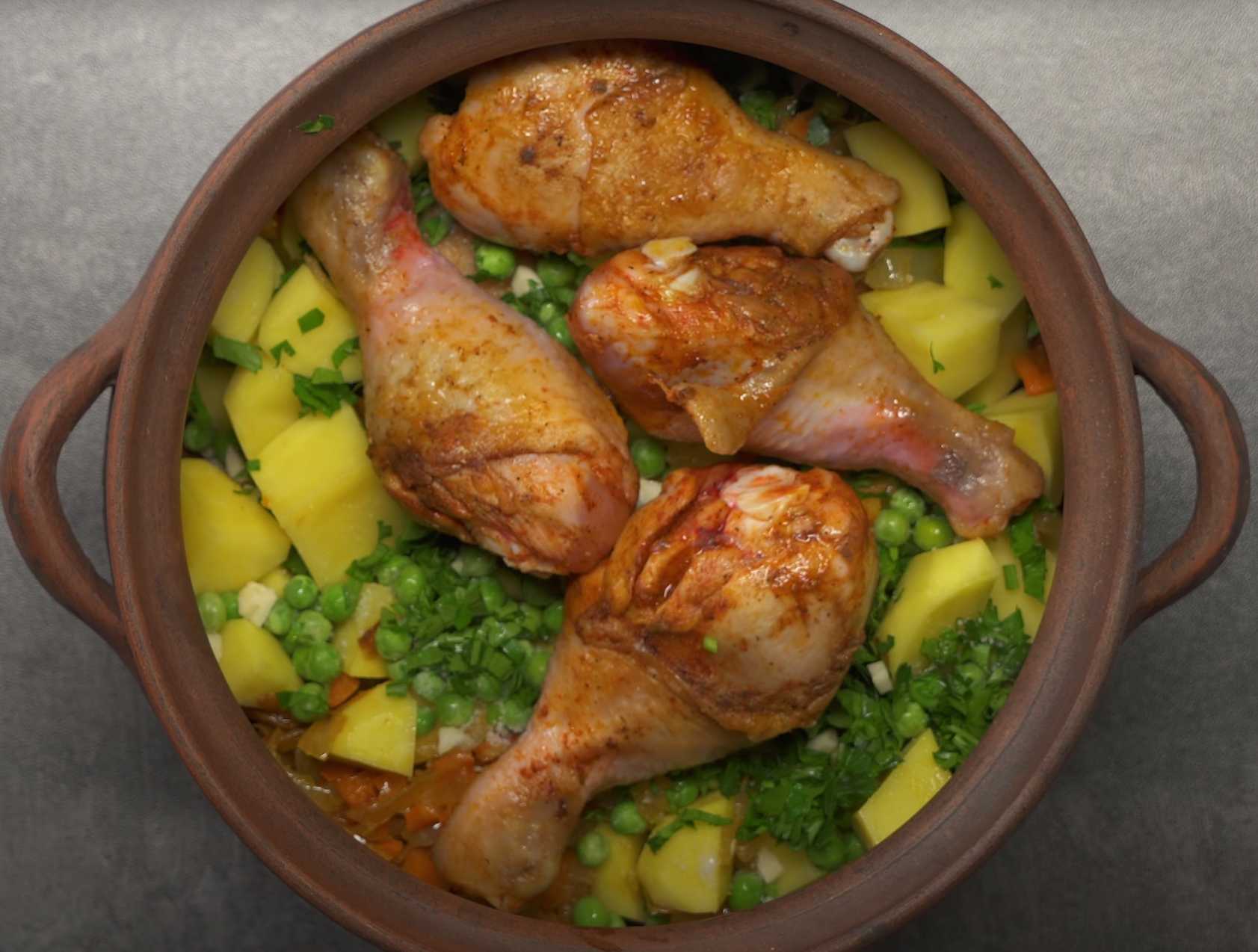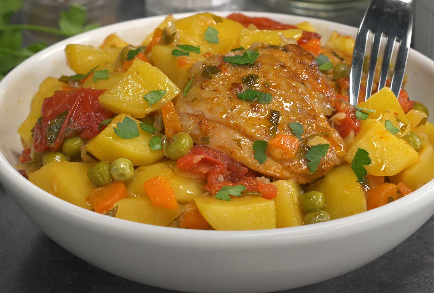 Le pot-au-feu est un plat très tendre et savoureux, car la viande et les légumes s'harmonisent parfaitement. Préparez ce pot-au-feu avec des cuisses de poulet, des pommes de terre, des légumes et des herbes aromatiques.