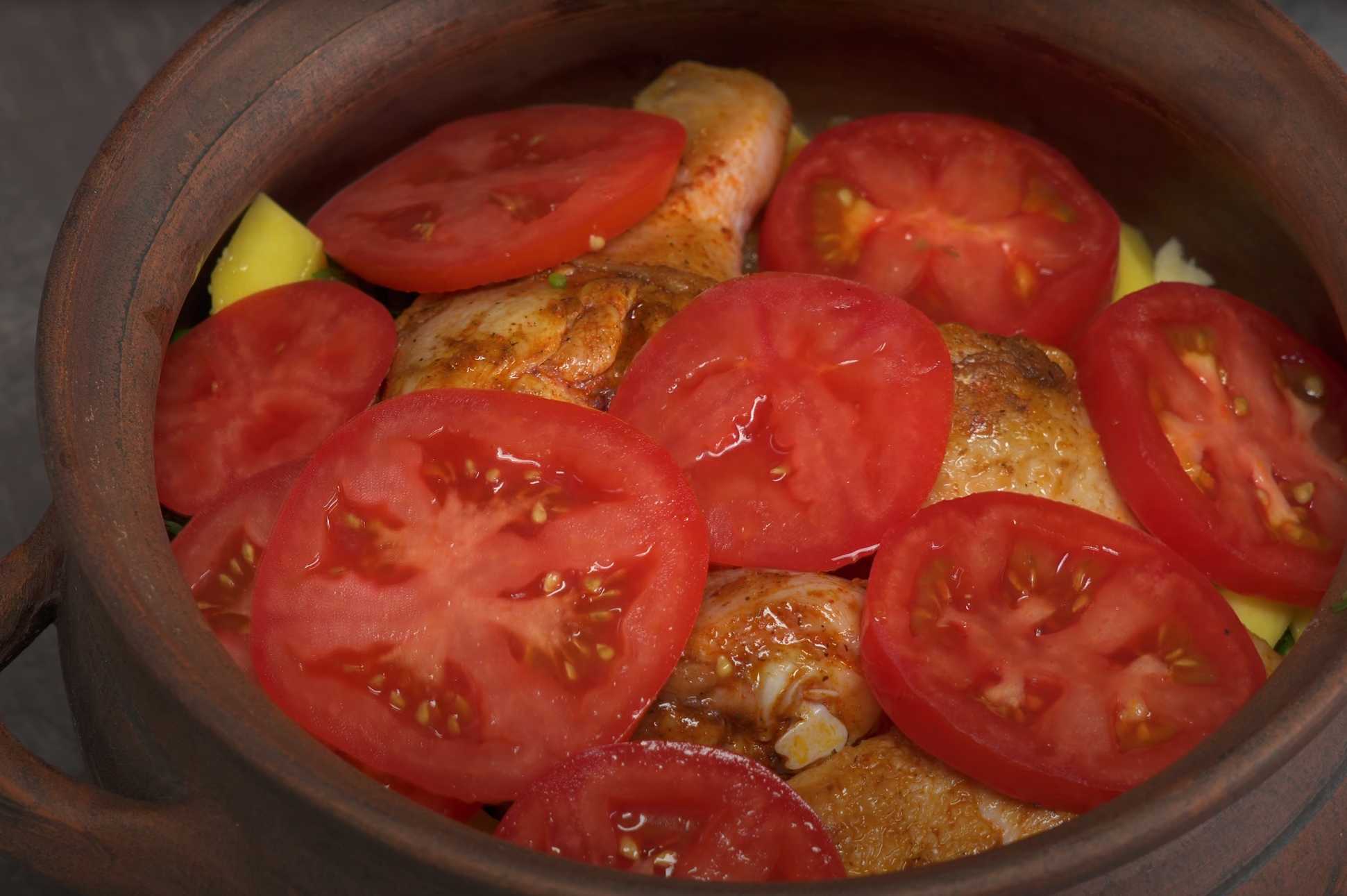 Coupez les tomates en tranches et disposez-les sur le poulet.