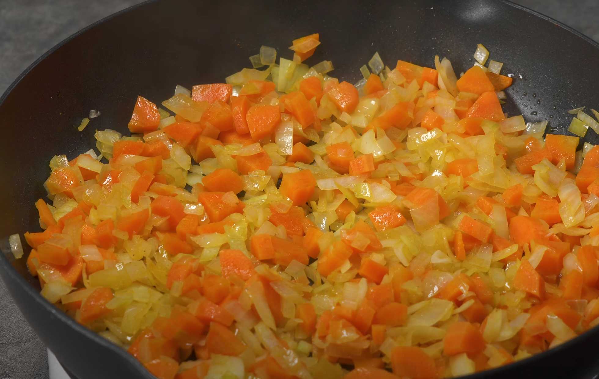 Ajoutez l'oignon finement haché et les carottes coupées en dés dans la poêle. Faites revenir en remuant pendant 4 à 5 minutes.