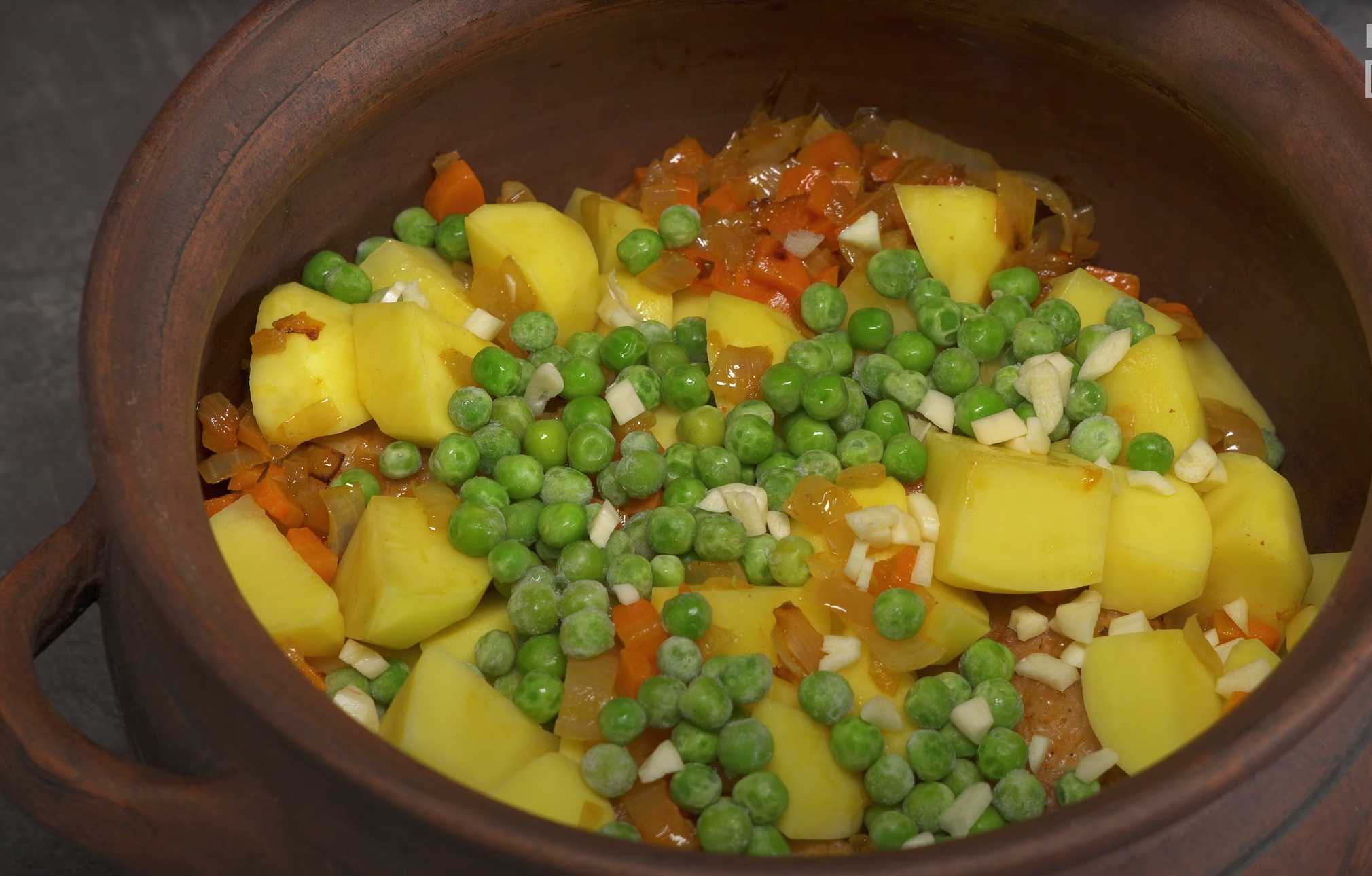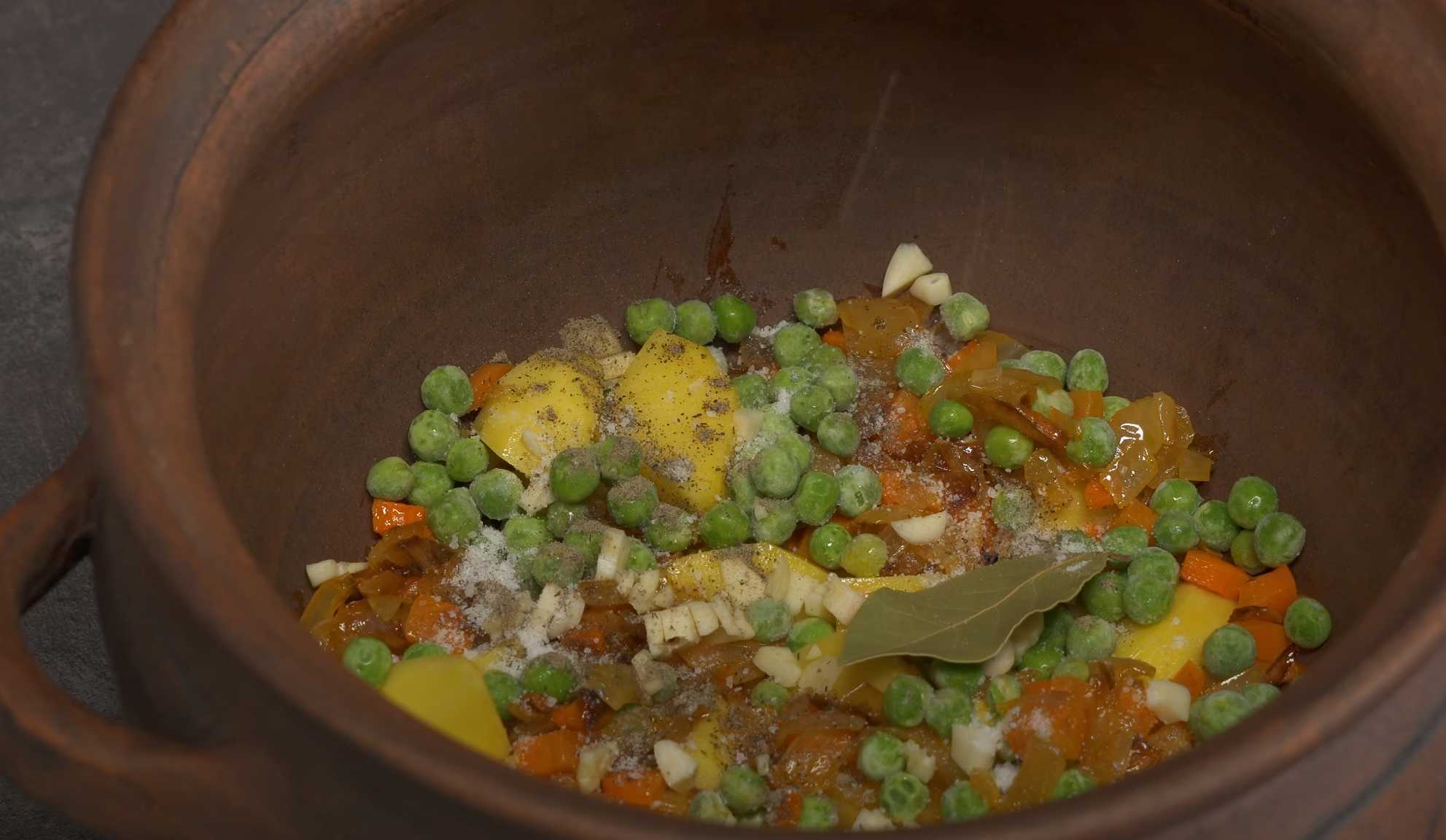 Ajoutez une partie des légumes frits, les petits pois, l'ail haché, la feuille de laurier, le poivre noir, le sel et le persil haché.